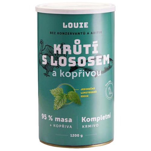 Šťavnatá konzerva obsahuje 95 % mletého krůtího masa s lososem. Kromě masa se v konzervě nachází i rozemletý neškodný prášek z kostí daného druhu masa, který funguje jako přírodní zdroj vápníku a fosforu rovnou v přirozeném poměru, a 2 % příměs kopřivy, která slouží jako doplněk pro podporu peristaltiky střev a simulaci minoritní rostlinné složky v potravě psů. Hafo snadné - Otevřeš, vysypeš a utřeš vlastní slinu. Jednodušší už to být nemůže. A pokud tvůj čtyřnohý parťák nezvládne na Boží hod celou konzervu, zakryj ji plastovým víčkem a v klidu ji odlož do lednice. Maso zůstane čerstvé a ani ho neucítíš. Hafo zdravé - 95 % masa, 4 % rýže a 1 % minerálů a vitamínů. Prostě to, co by si pes ve volné přírodě sám ulovil a co je dobré pro jeho žaludek. Žádné konzervanty, dochucovadla ani barviva. Hafo chutné - Zase králík? Kdepak. Nabízíme několik druhů masa, na kterých by sis pochutnal i ty. Dáváme totiž důraz na kvalitní maso z českých a slovenských chovů. Složení: 95 % masa (krůtí, losos), kopřiva. Analytické složky: hrubý protein 13 %, hrubý tuk 6 %, hrubá vláknina 1 %, hrubý popel 0 %. Nutriční doplňkové látky: vitamin D3 (200 IU/kg), jodičnan draselný (0,2 mg/kg), glukonát manganatý (1,5 mg/kg), citran zinečnatý (10 mg/kg). Krmný návod: Louie je přírodní krmivo, na kterém si pochutnají dědouši i štěnda. Konzervy mají vysokou energetickou hodnotu a obsahují proteiny a aminokyseliny, které jsou nezbytné pro růst i regeneraci tkání. Nejlépe si ji mazel vychutná při pokojové teplotě 5–25 °C. Uchovávej ji v suchu a mimo přímé světlo. Po otevření ji zakryj víčkem, ulož do lednice a spotřebuj do 3 dnů. Dávkování: 200 g krmiva na 5 kg hmotnosti psa denně.