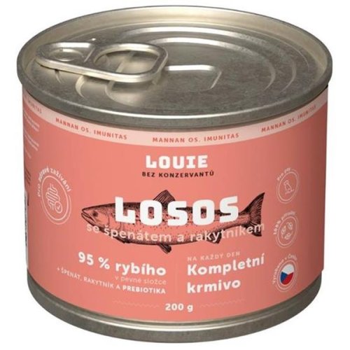 Složení: losos, vývar, rakytník, špenát, prebiotika (mannanoligosacharidy/fruktooligosacharidy), minerály a vitamíny. Analytické složky: hrubý protein 10,5 %, hrubý tuk 9,5 %, hrubý popel 1 %, hrubá vláknina 1,5 %, vlhkost 77,5 %. Nutriční doplňkové látky na 1 kg: cholinchlorid 700 mg, vitamín B1 1,2 mg, vitamín B2 2,2 mg, vitamín B6 0,9 mg, vitamín D3 450 m.j., vitamín E min. 15 m.j., oxid manganatý 23 mg, oxid zinečnatý 50 mg, kyselina listová min. 225 μg, vitamín A 11 500 m.j., vitamín B3 15 mg, jodid draselný 0,8 mg, síran měďnatý pentahydrát 12 mg. Krmný návod: