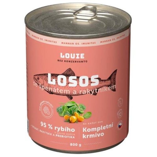 Složení: losos, vývar, rakytník, špenát, prebiotika (mannanoligosacharidy/fruktooligosacharidy), minerály a vitamíny. Analytické složky: hrubý protein 10,5 %, hrubý tuk 9,5 %, hrubý popel 1 %, hrubá vláknina 1,5 %, vlhkost 77,5 %. Nutriční doplňkové látky na 1 kg: cholinchlorid 700 mg, vitamín B1 1,2 mg, vitamín B2 2,2 mg, vitamín B6 0,9 mg, vitamín D3 450 m.j., vitamín E min. 15 m.j., oxid manganatý 23 mg, oxid zinečnatý 50 mg, kyselina listová min. 225 μg, vitamín A 11 500 m.j., vitamín B3 15 mg, jodid draselný 0,8 mg, síran měďnatý pentahydrát 12 mg. Krmný návod: