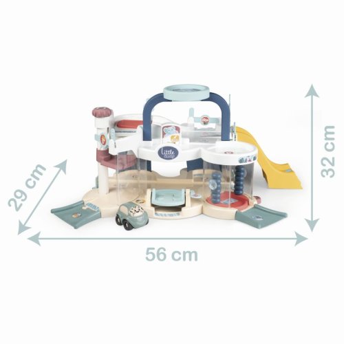 Multigaráž Little Smoby má velký otočný nákladní výtah, parkoviště a velké rampy ke sjíždění. Skoková rampa poskytuje potřebnou hybnost pro rychlejší jízdu. Pohyblivé zábrany ukazují, kde je průjezd zakázán, protože rampa může být instalována na dvou různých místech. Nad parkovací plochou je helipad, kde startuje a přistává vrtulník. Ve spodní části multigaráže s dílnou a myčkou je o autíčka dobře postaráno. Široké nájezdové rampy a zábrany zajišťují regulovaný proces. Sada obsahuje jedno mini autíčko. Rozměry produktu (DxŠxV): 56 x 29 x 32 cm.