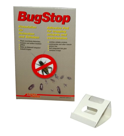 Bug Stop od Lucky Reptile je papírová past s lepkavou plochou uvnitř. Stačí proužek Bug Stop vyjmout z balení, odstranit krytí lepkavého pásku, jednoduše složit past do podoby trojúhelníku a umístit ke stěně místnosti. Ideální je instalovat pasti navečer, abychom ráno mohli odstranit Bug Stop plný chycených cvrčků nebo švábů.