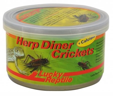 Konzervovaní cvrčci. Specialitou konzervovaných krmiv od Lucky Reptile je fakt, že do většiny je přidáván sépiový prášek jako zdroj vápníku. To platí i o konzervovaných cvrčcích ze série krmiv Herp Diner. Tito cvrčci pak mají optimální poměr vápníku a fosforu, jsou tedy naprosto vhodným krmivem pro většinu plazů.