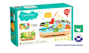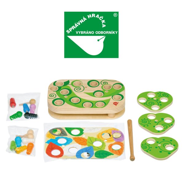 Chytání housenek je dřevěná motorická stolní hra s magnety, která se skládá ze základní dřevěné desky, 7 barevných vyměnitelných předloh, 10 barevných housenek s magnetem, magické hůlky s magnetem, 3 otáčivých listů, 3 kolíků pro upevnění listů a lněného pytlíku. Šibalské housenky začaly hrát na schovávanou! Najděte a chyťte je společně s dětmi pomocí kouzelné hůlky s magnetem. Způsobů, jak pochytat housenky je spousta. Pro menší děti přiložte na základní desku jednu z barevných předloh, vložte housenky do otvorů například podle barev a lov kouzelnou magnetickou hůlkou může začít. Vyměňováním předloh mohou děti housenky lovit například z barevných listů, domečků nebo také podle čísel. Starším dětem ztížíte chytání housenek tím, že na předlohu přidáte otáčivé listy, které zafixujete kolíkem tak, aby se mohly po předloze rotačním způsobem pohybovat a tím lovení ztížíte. Tato hra je velmi užitečná pro rozvoj logického myšlení, kreativity, obratnosti a dětské motoriky. Součástí výrobku je lněný pytlík, do kterého si menší části hry pěkně uložíte.