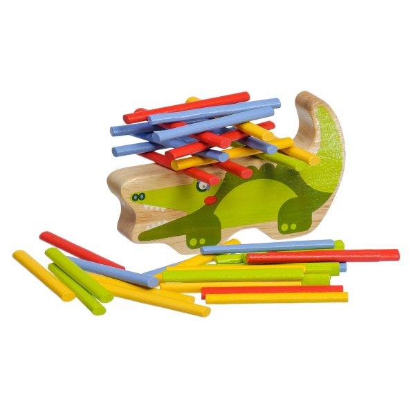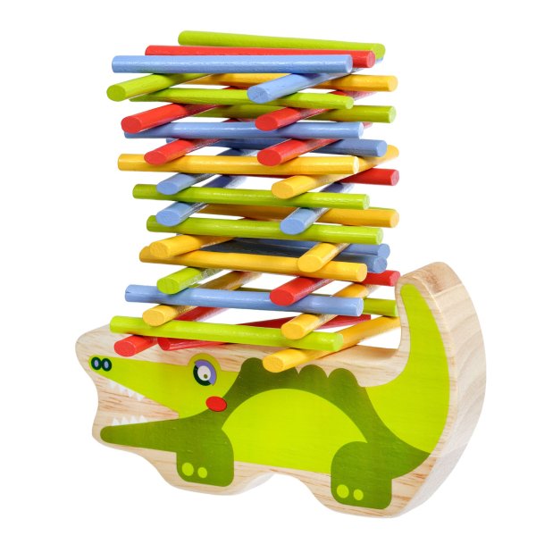 Krokodýl je dřevěná balanční hra, která se skládá ze základny v podobě krokodýla a 40 barevných tyčinek ve čtyřech základních barvách. Cílem hry je umístit všechny barevné tyčinky ve stylu hry „Jenga“ na horní stranu krokodýla tak, aby byla věž vyvážená a nespadla. Je to skvělý způsob, jak u dětí zábavným způsobem trénovat trpělivost, podporovat jemnou motoriku, naučit je pečlivému plánování a celkově vyzkoušet jejich schopnosti v jednoduché a zábavné výzvě. Součástí balení je uzavíratelný bavlněný pytlík, do kterého si sadu pěkně uložíte a lze ji vzít kamkoli s sebou. Rozměr bavlněného pytlíku 17 x 23 cm. Délka krokodýla 14 cm, výška 8 cm, šířka 2 cm. Délka tyčinek 7,5 cm.