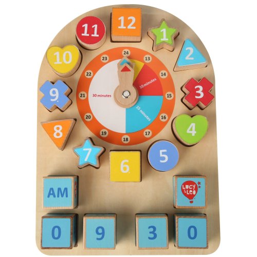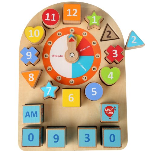 Dřevěnou naučnou hrací desku s hodinami a tvary lze využít k učení času a hodin. Deska obsahuje obrázky různých časových intervalů a velké barevné hodinové ručičky s jasnými časovými segmenty. Kolem ciferníku jsou různé geometrické tvary s označenými barevnými čísly, které dětí vkládají do zdířek tak, aby vytvořily ciferník po sobě jdoucími čísly. V dolní části hrací desky jsou kostky s čísly, ze kterých děti mohou vložením do zdířek vytvořit digitální hodiny. Nad nimi je ještě jedna kostka, která určuje buďto denní dobu am nebo noční dobu pm – možno využít při výuce anglického jazyka. Tímto hravým způsobem se děti rychle naučí pouhým pohledem rozeznávat a určovat čas a hodiny. Tato hračka je označována jako Montessori pomůcka.