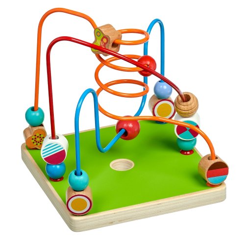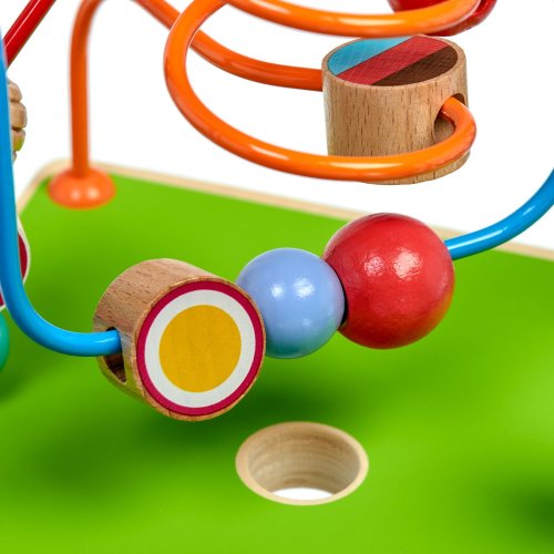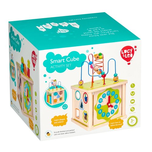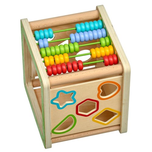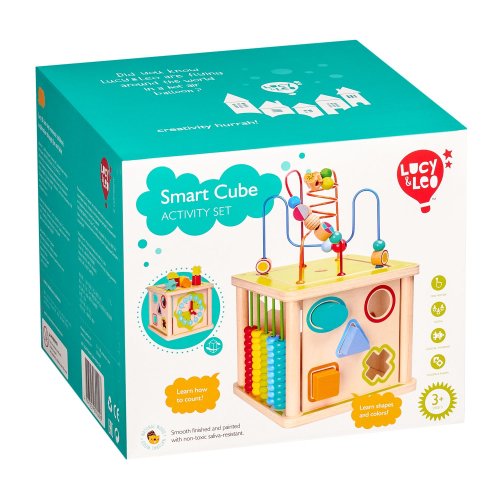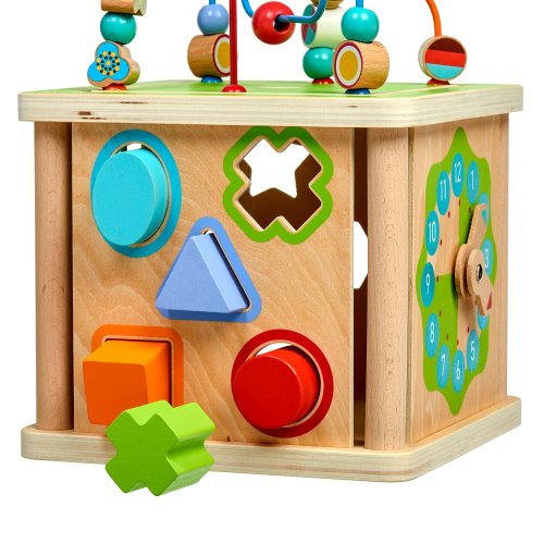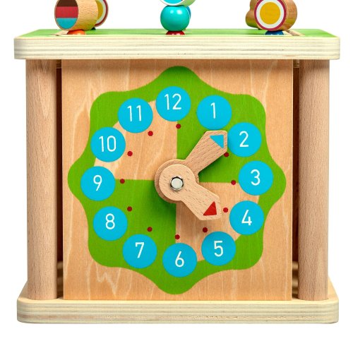 Dřevěná motorická kostka 5v1 s hodinami kombinuje několik vzdělávacích a zábavných prvků najednou. Nahoře najdete korálkový labyrint se třemi zakřivenými kolejnicemi, který se dá vyjmout a otočit směrem do kostky tak, aby byl zcela uschován. Na ostatních stranách jsou hodiny s ručičkami, 2 vkládačky geometrických tvarů a barevné počítadlo. Všechny strany jsou barevně zdobeny tak, aby udržely pozornost dítěte, podporovaly jeho fantazii a senzomotorické schopnosti.