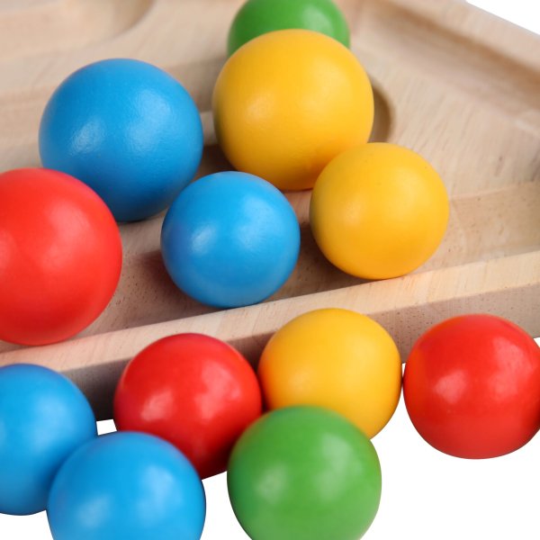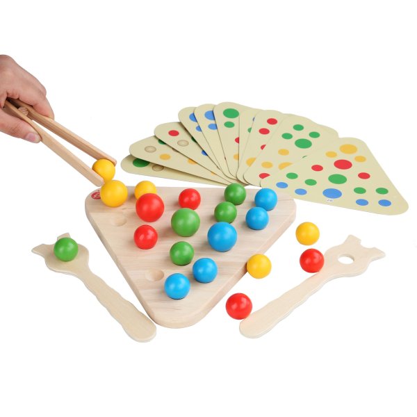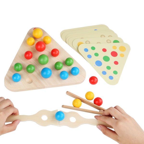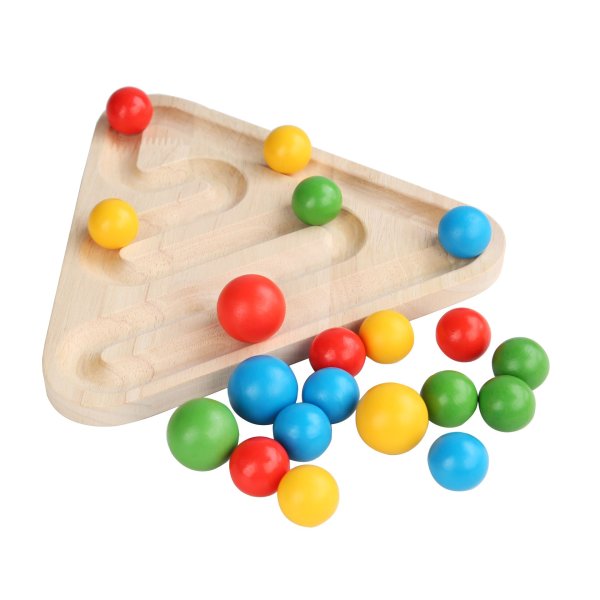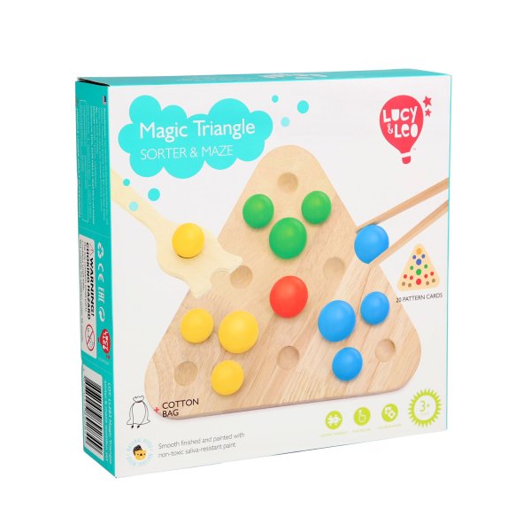 Magický trojúhelník 2v1 je dřevěná oboustranná hra, která pomáhá dětem rozvíjet logické myšlení, jemnou motoriku a procvičuje paměť. Můžete si vybrat ze dvou variant. 1. varianta: Třídič – pomocí pinzety a lžíce uspořádejte kuličky různých velikostí dle 20 přiložených předloh. 2. varianta: Bludiště – prokoulejte bludištěm rychlé kuličky, ale pozor, aby vám nevypadly z dráhy. Po skončení hry lze kuličky umístit do lněného pytlíku, který je součástí balení. Tato hračka je označována jako Montessori pomůcka. Rozměr oboustranné hrací desky 29 cm x 23 cm x 1,4 cm. Rozměr oboustranných předloh 16cm x 15 cm. Průměr velkých kuliček 3,3 cm 4 ks. Průměr malých kuliček 2,5 cm 16 ks. Rozměr pinzety 13 cm x 5 cm x 2 cm 1 ks. Rozměr lžíce 17 cm x 4,5 cm 2 ks.