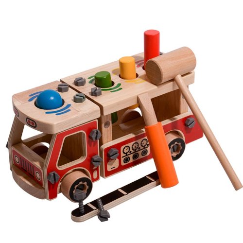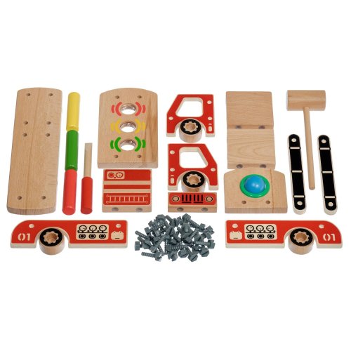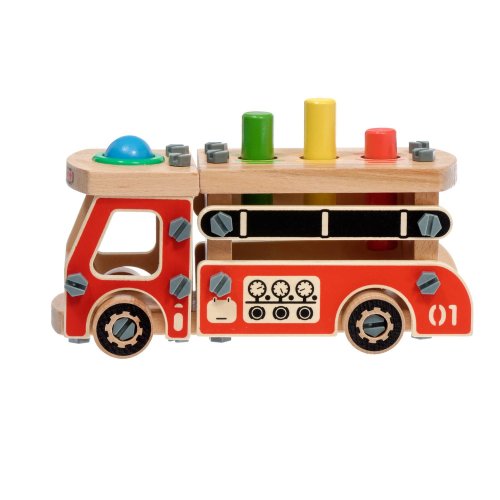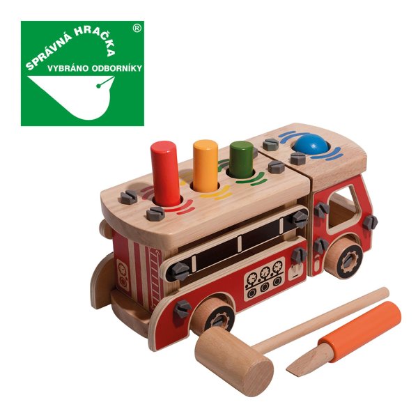 Dřevěná konstrukční sada Hasiči zaujme především chlapce. Sada obsahuje spoustu dřevěných dílů, šroubů a nářadí pro montáž, plus kladívko a 4 zatloukací dřevěné prvky. Po sestavení a sešroubování všech dřevěných dílů získá malý stavitel krásné hasičské auto, která má na střeše korby a návěsu navíc čtyři otvory určené pro zatloukání jednotlivých zatloukacích prvků. Kromě jemné motoriky se dítě při hře s touto hračkou naučí rozlišovat tvary a barvy, trénovat paměť, pozornost a trpělivost. Balení obsahuje 17 dřevěných dílů k sestavení auta, spoustu šroubků, 1 šroubovák, 3 barevné kolíky a 1 kouli k zatloukání a kladívko. Tato hračka je označována jako Montessori pomůcka.