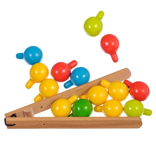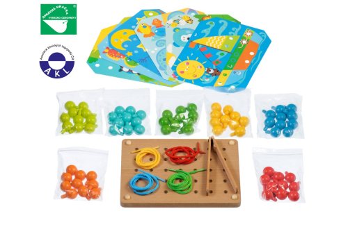 Mozaika s pinzetou a vyšívání je dřevěný herní set rozvíjející jemnou dětskou motoriku, tvořivé myšlení a znalost barev. Balení obsahuje 70 velkých dřevěných barevných kolíčků, 1 pinzetu pro uchycení kolíčků, 12 barevných oboustranných obrázků se zvířátky, dřevěný podstavec s otvory na kolíčky a 4 barevné tkaničky k vyšívání. Dítě si vybere jednu z barevných předloh, položí jí na dřevěný podstavec a začne obrázek vyplňovat pomocí přiložené pinzety barevnými kolíčky, nebo rukou. Pokud děti mají chuť, mohou barevnými tkaničkami také vyšívat. Rozměry dřevěného podstavce 20,5 x 15 cm. Délka tkaniček 64 cm. Výška kolíčku s kulatou hlavičkou 2,8 cm, průměr 1,5 cm. Po skončení hry lze dřevěné kolíčky umístit do lněného pytlíku, který je součástí balení. Tato hračka je označována jako Montessori pomůcka.