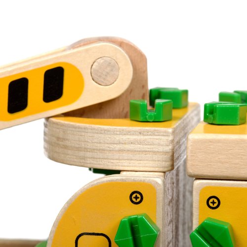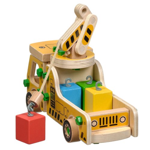 Dřevěná konstrukční sada Autojeřáb zaujme především chlapce. Sada obsahuje spoustu dřevěných dílů, šroubů a nářadí pro montáž, plus dřevěné kostky představující náklad. Po sestavení a sešroubování všech dřevěných dílů získá malý stavitel krásný autojeřáb. Přiložené samostatné kostky různých barev představující náklad mají na vrchní straně háčky, díky kterým je hák na autojeřábu může zvednout a přemísťovat. Kromě jemné motoriky se dítě při hře s touto hračkou naučí rozlišovat tvary a barvy, trénovat paměť, pozornost a trpělivost. Balení obsahuje 16 dřevěných dílů k sestavení auta, spoustu šroubků, 1 šroubovák, 4 barevné kostky jako náklad. Tato hračka je označována jako Montessori pomůcka.