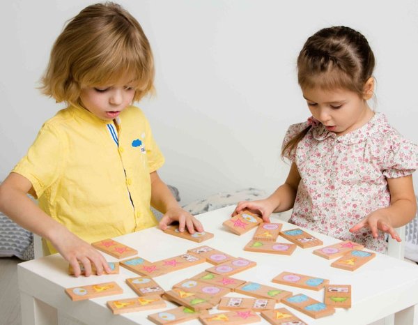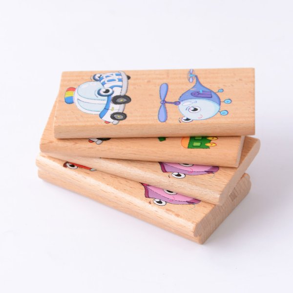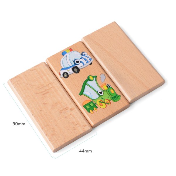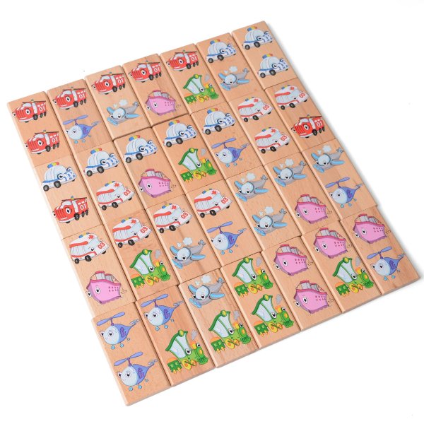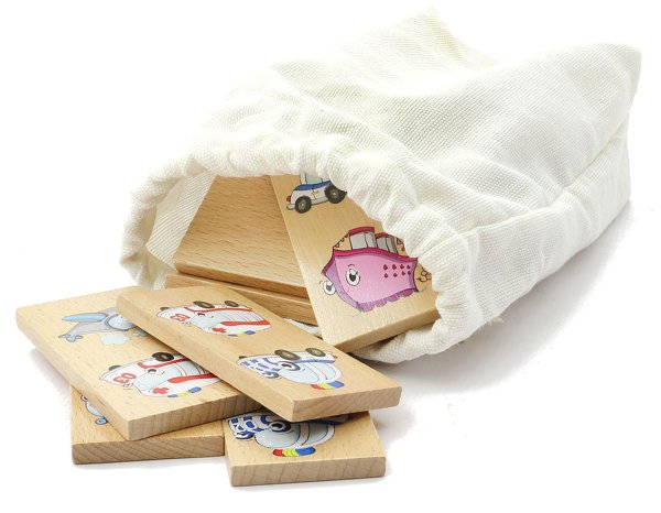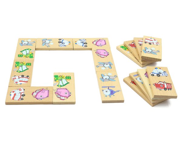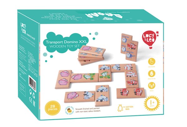 Domino XXL s motivem dopravních prostředků obsahuje 28 dřevěných velkých dílků, na kterých jsou znázorněny veselým způsobem hasiči, sanitka, policejní vůz, mašinka, parník, vrtulník a letadlo. Kromě klasické hry, kdy se k sobě přikládají kartičky tou stranou, na které je stejný motiv, tak děti mohou najít a pojmenovat i zástupce jednotlivých skupin dopravních prostředků a něco si i o nich povědět.