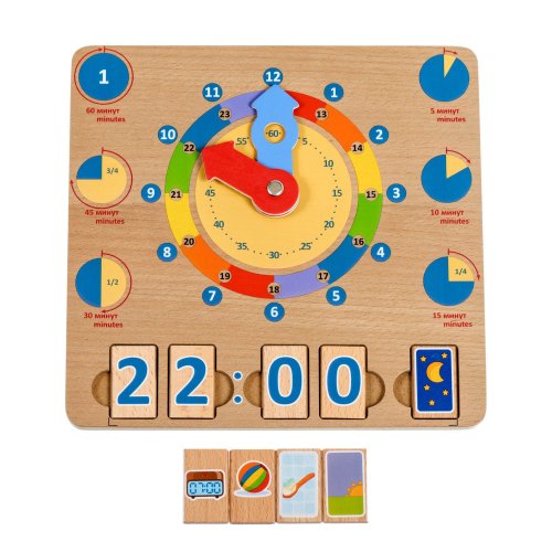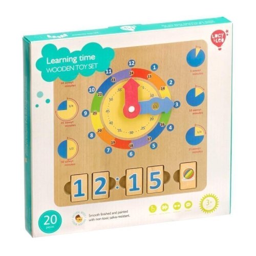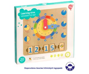 Dřevěnou naučnou hrací desku s hodinami lze využít k učení času a hodin. Deska obsahuje obrázky různých časových intervalů a velké barevné hodinové ručičky s jasnými časovými segmenty. Dále ji tvoří 14 bloků s čísly a 6 bloků s obrázky denních činností. Čtyři časové bloky lze vložit do zdířek tak, aby představovaly digitální hodiny, a pátý blok představuje akci, která je přítomna v denním režimu dítěte ve stanovenou dobu. Tímto hravým způsobem se děti rychle naučí pouhým pohledem rozeznávat a určovat čas a hodiny. Rozměr desky 24 x 24 x 1cm, rozměr bloků 4 x 2,5 cm