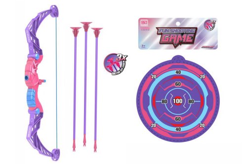 Luk se šípy a terčem fialový. Součástí luk, 3 šípy, terč. Délka luku 57 cm, průměr terče 18 cm.