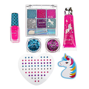 Sada Beauty-Design “Jednorožec”. Obsah: 2× dóza se třpytivým gelem, 1× lesk na rty s příchutí, 1× pilník na nehty, 1× slupovací lak na nehty, 1× nálepky „drahokam“ na nehty a obličej, 1× třpytivé krémové oční stíny s aplikátorem. Pro děti od 3let.