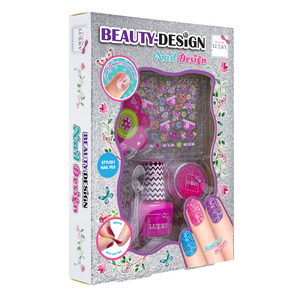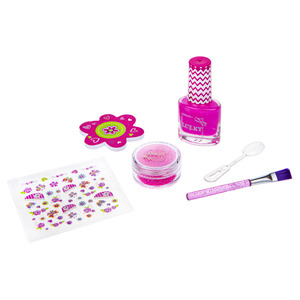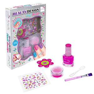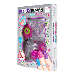 Sada Beauty-Design “Nehtové studio”. Obsah: 1× štětec, 1× pilník na nehty, 1× samolepky na nehty, 1× slupovací lak, 1× dózička se třpytkami, 1× lžička. Proděti od 3let