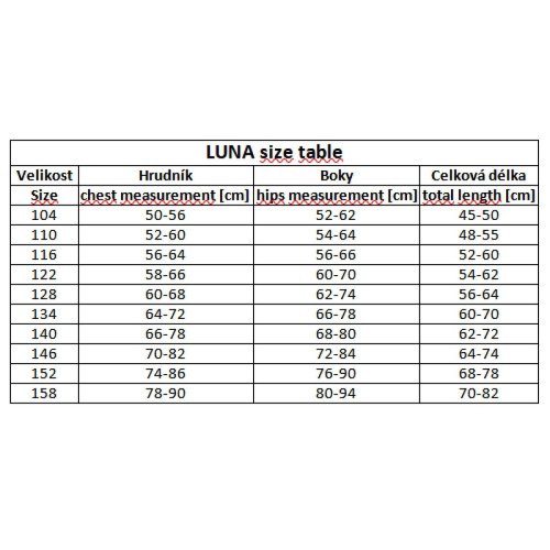 Aqua-Speed LUNA jsou nádherné jednodílné sportovní plavky pro dívky. Aqua-Speed Luna nabízí moderní design, podšívku na přední straně a otevřená záda. Plavky jsou vyrobené z měkkých tkanin Malaga vysoce odolných vůči chlóru a UV záření. Juniorské sportovní plavky Aqua-Speed Luna budou skvěle fungovat při běžném koupaní i při plaveckém tréninku. Materiál: Malaga (80% Poliamid 20% Elastan) Vlastnosti tkaniny Malaga: Malaga je neprůhledná látka, která nabízí dokonalou rovnováhu mezi nízkou hmotností a elasticitou. Díky použití technologie Lycra Extra Life má Malaga vysokou odolnost vůči chloru a otěru. Díky ochraně proti UV záření je Malaga ideální pro výrobu plážového oblečení a splňuje nejvyšší specifikace pro odvětví sportovního oblečení. Velikostní tabulka v obrázcích. Uvedené hodnoty jsou pouze orientační a vhodná velikost se může lišit dle konkrétního typu postavy.