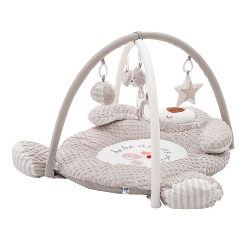 Podložka má hrazdičku s odnímatelnými hračkami, které lze libovolně přemísťovat nebo používat samostatně. Každé miminko si najde něco zajímavého – zrcátko, šustící prvky, pískátko, měkké kousátko, zvoneček i hračku s vestavěným přehrávačem, která po stisknutí přehraje příjemnou melodii.