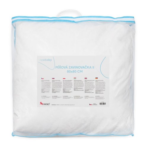 Luxusní péřová zavinovačka 80x80 bez prodlouženého cípu české značky New Baby je synonymem komfortu ve spaní. Péřová zavinovačka poskytuje miminku měkkoučký pocit, teplo a pocit bezpečí jako v bříšku. Pomáhá tak miminku se adaptovat na nové podmínky. Díky vynikajícím vlastnostem peří zajišťuje zavinovačka miminku stabilní teplotu. Peří absorbuje vlhkost a odvádí ji od lidského těla během spánku. Speciální čištěné, testované peří. Naše peřinky obsahují 80 procent ručně draného husího peří a 20 prachové peří výplně ( 0,3 kg),