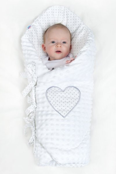 Luxusní šněrovací zavinovačka z Minky New Baby. Zavinovačka je vyrobena ze dvou typů tkanin a je zdobena krásným vyšívaným srdíčkem a šedým puntíkovaným bavlněným podkladem. První je velmi měkká a na dotek příjemná, hebká Minky látka s výstupky pro stimulaci senzomotoriky a druhou je 100% bavlna. Zavinovačka se zavazuje na tři řady stuh, které Vaše miminko pevně zavinou.