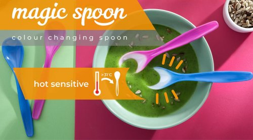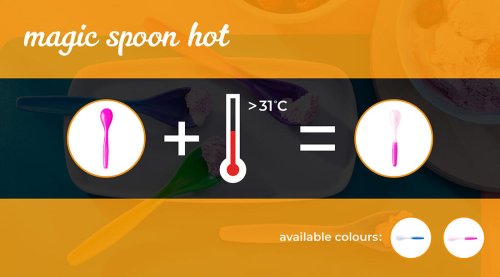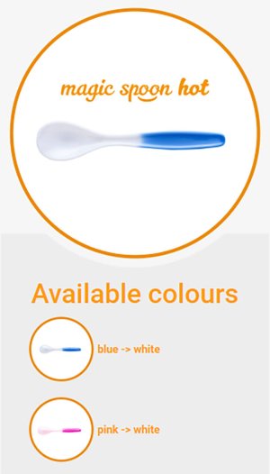 Plastová lžička, měnící barvu, když je vystavena teplu. Reaguje na teploty nad 31 °C. Lžičky jsou bezpečné bez BPA, PAH a ftalátů.