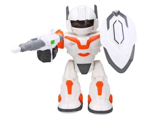 chodí vydává zvuk svítí mu oči horní část těla se otáčí o 360° v ruce drží zbraň a štít výška cca 20 cm