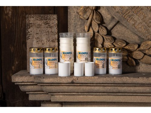 Bílé svíčky Madona vhodné pro hřbitovní účely. Hoří až 15 hodin. Balení obsahuje 4 ks.