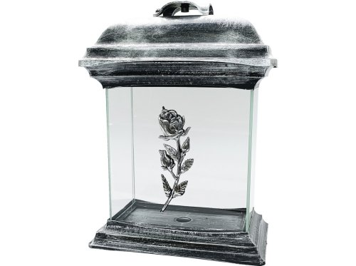 Elegantní a stylová hřbitovní lucerna Madona o výšce 26 cm ve tvaru katedrály s motivem stříbrné růže. Tento design dodává pietní výzdobě jemnost a decentní krásu. Ideální volba pro ty, kdo chtějí do výzdoby zapracovat symboliku růže a stříbrné elegance. Kvalitní provedení zajišťuje dlouhou životnost a důstojný vzhled.