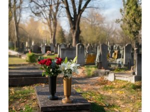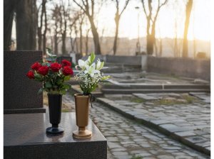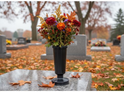Plastová hřbitovní váza se zátěží pro bezpečné a stabilní umístění květin na hrobě.