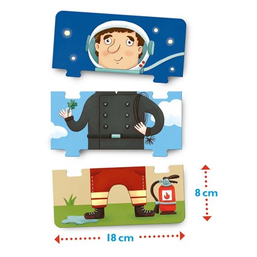 Astronaut se sukní a hasičskou helmou? Kominík s pouty a lékařským pláštěm? Nebo vám lépe vyhovuje údržbářská kombinéza? Části třídílných skládaček lze mezi sebou libovolně zaměňovat. S extra velkými dílky si mohou malí milovníci puzzle snadno vymýšlet své vlastní bláznivé práce. Hlavolam u dětí hravou formou procvičí koncentraci a kreativitu, dále se také naučí něco o zaměstnání. Hlavní vlastnosti: rozvíjí představivost a koncentracizlepšuje obratnost a koordinaci ruka-okoskvělé pro edukaci o práci