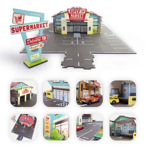 MyRoads je k životnímu prostředí šetrná hra z udržitelného, přírodního dřeva z odpovědných zdrojů. Odolné dětské silnice se snadno spojují a jsou vyrobeny německou společností Werkhaus. Spolu s MyRoads Starter set (zahrnující všechny druhy silnic), naleznete v této řadě spoustu doplňkových sad, jenž můžete jakkoli vzájemně kombinovat. Včetně budovy supermarketu/restaurace obsahuje tato 38dílná sada také parkovací místa, výjezd a vjezd a mnoho dalších krásných detailů pro realistický herní zážitek. Poznámka: Jelikož jde o výrobky z přírodního dřeva mohou vykazovat drobné barevné odchylky. Autíčka nejsou součástí balení. Hlavní vlastnosti: vintage design a detailní provedeníkompatibilní se všemi produkty řady MyRoadspodporuje představivost, obratnost a koordinacivyrobeno z udržitelných a zodpovědně získaných přírodních materiálů