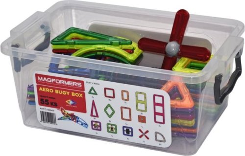 Aero Bugy je magnetická stavebnice ze které postavíte větrné věže, helikoptéry, vznášedla a letadla všeho druhu. Sada obsahuje mnoho oblých tvarů a je z ní možné vytvářet mnoho variací aerodynamických tvarů, což ocení malí designéři především u závodních aut, bugyn, raket a kosmických korábů. Počet dílků: 55