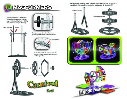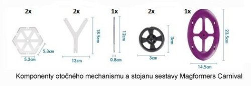 Balíček plastových dílků potřebných k sestavení otočného stojanu stavebnice Carnival. Tento produkt je určen všem, kteří mají dostatek magnetických dílků pro stavění kolotočů, ruského kola a různých houpaček, které vytvoříte ze stavebnice Magformers Carnival, ale chybí jim specifické plastové doplňky k sestrojení stojanu s otočným mechanismem. K magnetické části se stojan připojuje pomocí šestibokých otočných panelů. Kromě "pouťových atrakcí" lze použít např. i ke stavbě rovnoramenných vah a celé řadě rotujících a houpacích komponent u větších staveb dle vlastní fantazie (roboti, pojízdná monstra, kinetické skulptury apod.) Doporučeno pro děti od 3 let. Dodává se zatavené v plastové folii (bez kartonové krabice a bookletu). Kreativní magnetická stavebnice Magformers umožňuje sestavovat velké množství trojrozměrných objektů, pomocí dvourozměrných plastových mnohoúhelníků. Magformers procvičuje jemnou motoriku, podněcuje tvořivost, učí děti barvy a základní geometrické tvary. Rozměry dílků a vhodně volené tvary zajišťují maximální možnou bezpečnost hračky . Materiál, z kterého je stavebnice vyrobena splňuje nepřísnější hygienická a zdravotní kritéria. Dílky jsou dostatečně velké, nelze je spolknout a jsou prakticky nerozbitné. MAGFORMERS lze velmi dobře kombinovat i se známou magnetickou stavebnicí Geomag.