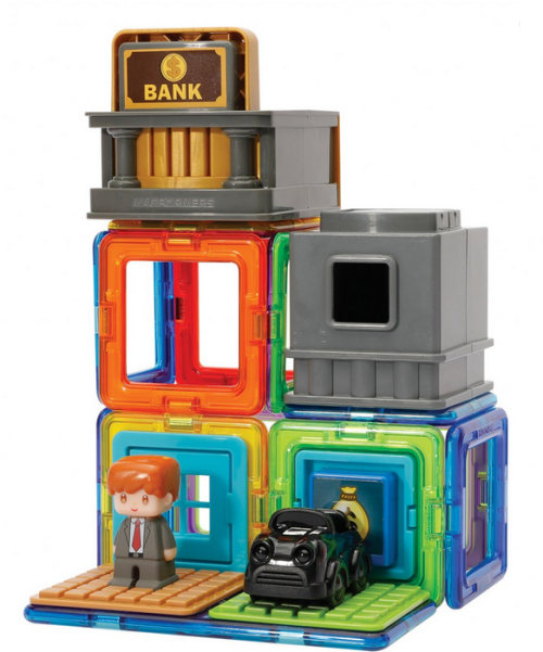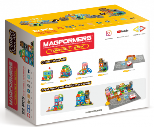 Obsahuje 12 magnetických tvarů a 10 funkčních doplňků vč. malého bankéře. Lze sestavovat různě architektonicky řešené stavby bankovního domu dle vlastní fantazie. Přidáním dalších dílků Magformers získají vaše stavby na velikosti a různorodosti. Výsledné stavby mají formu poloodkrytého průřezu, kde jsou z jedné strany patrné vnější kontury stavby a z druhé interiérové řešení, které lze postupně obměňovat.