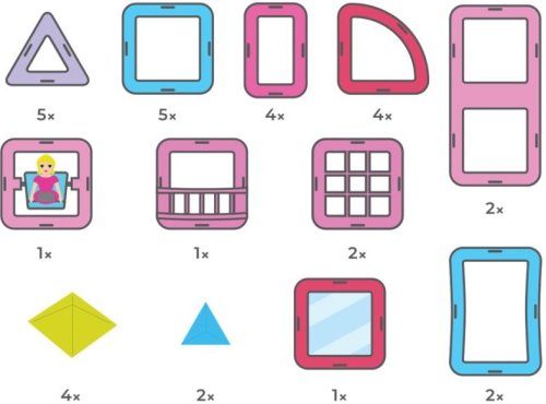 Trojúhelník 5x Čtverec 5x Obdélník 2x Obdélníček 4x Výseč 4x Oblouk 2x Figurka Princezna 1x Zrcadlový čtverec 1x Balkon 1x Okno dělené 2x Lux pyramidy Color 4x Lux,pyramidy trojboke 2x