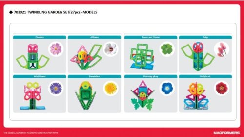 Co lze vytvořit: S Magformers Třpytivá zahrada můžete postavit různé zahradní scenérie, květiny, zvířátka a mnoho dalších tvarů a objektů. Vaše fantazie je jediným limitem! Obsahuje celkem 27 dílků: