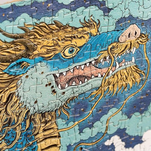 Metalické puzzle má speciální povrch, který se na světle z různých úhlů kovově leskne a vytváří tak dojem, že je puzzle ze zlata, stříbra a dalších lesklých kovů. Rozměr složeného puzzle cca 69 x 51 cm