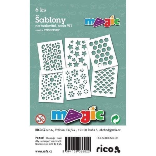 Sada 6ks papírové šablony na malování. Materiál bílý karton 220g. Doporučujeme pro malování s magickými voskovkami (technika frotáž), vhodné i pro tupování s temperami, pro malování s foukacími fixami nebo techniku malování plastelínou. Nevhodné pro děti do 3.let, obsahuje malé dílky. Rozměry 11x14cm.