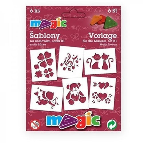 Sada 6ks papírové šablony na malování. Materiál bílý karton 220g. Doporučujeme pro malování s magickými voskovkami (technika frotáž), vhodné i pro tupování s temperami, pro malování s foukacími fixami nebo techniku malování plastelínou. Rozměry 11x14cm.