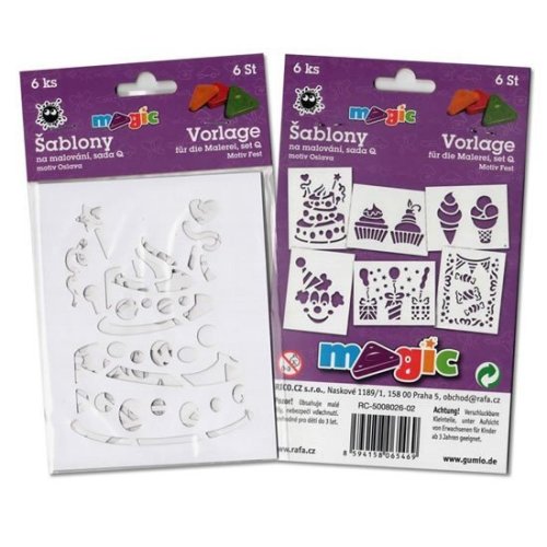 Sada 6ks papírové šablony na malování. Materiál bílý karton 220g. Doporučujeme pro malování s magickými voskovkami (technika frotáž), vhodné i pro tupování s temperami, pro malování s foukacími fixami nebo techniku malování plastelínou. Rozměry 11x14cm.