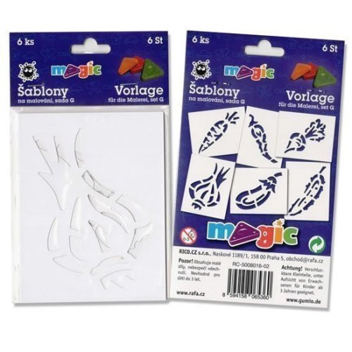Sada 6ks papírové šablony na malování. Materiál bílý karton 220g. Doporučujeme pro malování s magickými voskovkami (technika frotáž), vhodné i pro tupování s temperami, pro malování s foukacími fixami nebo techniku malování plastelínou. Rozměry 11x14cm.