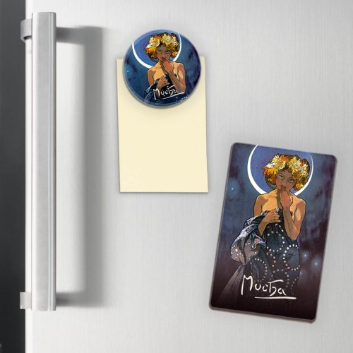 Kulatý magnet s motivem světově známého Alfonse Muchy, který můžete využít k přichycení vzkazů, fotek apod.