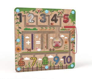 Vydejte se na cestu přírodou s barevnými kuličkami. Provedete úspěšně různobarevné kuličky všemi zákoutími? Umístíte všechny do mlýna? Vejdou se tam? Nebo pomocí čísel na metru vytvoříte a vypočítáte příklad? K vedení kuliček se při hře využívá magnetické ukazovátko, které prověří dětskou trpělivost a koordinaci rukou a zraku. Dokážete pak navrátit kuličky zpět na své místo podle barvy? Je počet kuliček stejný jako číslo, do kterého jste je umístili? Zábavná dřevěná hra, která pomáhá dětem rozvíjet jemnou motoriku, orientovat se v prostoru a rozšiřovat slovní zásobu pojmenováváním barev a předmětů ve městě. Děti se také učí počítání zábavnou formou. Dřevěná základna v designu přírody je kryta odolnou průhlednou plastovou deskou, hračka je díky tomu bezpečná.<br> <br> Rozměry: 29,5 x 29,5 x 1,5 cm<br> Věk: 2+<br> Materiál: dřevo, plast, magnet, tkanina