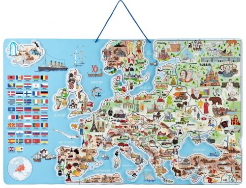 Naučné puzzle, školní pomůcka a společenská hra v jednom! Cílem je naučit dítě vnímat Evropu jako celek plný zajímavostí. Dítě pokládá dílky znázorňující jednotlivé státy nebo jejich části na magnetickou plochu. Učí se tak poznat, kam jednotlivé dílky patří. Později už bezpečně ví a osvojí si znalost, kde a na jaké části „starého kontinentu“ se jednotlivé země nacházejí. Díky obrázkům umístěným na každém dílku si děti ihned uvědomí, co je pro každou zemi charakteristické, co se kde pěstuje, vyrábí, těží, kde jaká zvířata žijí, event., kde se jaká stavba, budova, hrad či zámek nachází. S kompletně poskládanou mapou si pak s rodiči nebo kamarády zahrají hru, která bystří smysly a trénuje postřeh. Design a kresby pocházejí od českých designerů. Obsahuje: 192 dílků. Věk: 4+ Rozměr: 75 x 45 x 0,5 cm