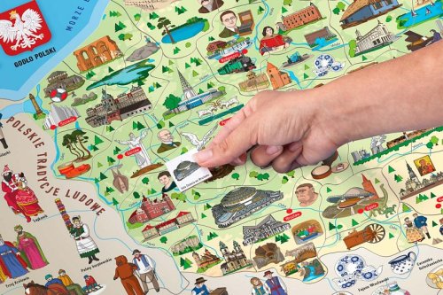 Naučné puzzle, školní pomůcka a společenská hra v jednom! Cílem je naučit vnímat dítě svou zemi jako celek plný zajímavostí. Současně se zde dítě naučí rozčlenit Polsko do jednotlivých vojvodství a určit jejich hlavní města. Na podkladové desce jsou rovněž zakresleny řeky a pohoří. Dítě přikládá dílky znázorňující jednotlivé okresy na podkladovou magnetickou plochu. Hranice jednotlivých vojvodství jsou vyznačeny výraznou linkou, která pomůže dítěti určit, kam který dílek patří. Později už bezpečně ví a osvojí si znalost, kde se jednotlivé vojvoství nacházejí, s kterými sousedí atd... Díky obrázkům umístěným na každém dílku si děti ihned uvědomí, co je pro každý okres charakteristické, co se kde pěstuje, vyrábí, těží, kde jaká zvířata žijí, event., kde se jaká stavba, budova, hrad či zámek nachází. S kompletně poskládanou mapou si pak s rodiči nebo kamarády zahrají hru, která bystří smysly a trénuje postřeh. Design a kresby pocházejí od českých návrhářů.| Věk: 3+ | Rozměr: 77 x 47 x 0,5 cm. | Toto autorské dílo je registrováno u Art&Copyright pod číslem 215-15-21-01 ze dne 26.3.2021.