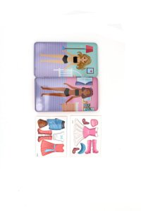 Součástí balení je třináct magnetických kousků oblečení a doplňků, které lze podle libosti připevňovat na postavičky. Oblečení je barevné a různorodé, například růžové a bílé šaty, modrý svetr či elegantní kozačky, což umožňuje vytvořit množství různých kombinací a outfitů. Magnety pevně drží na deskách, děti tak mohou snadno měnit vzhled panenek bez obav, že by se oblečení odlepilo.