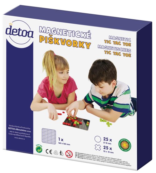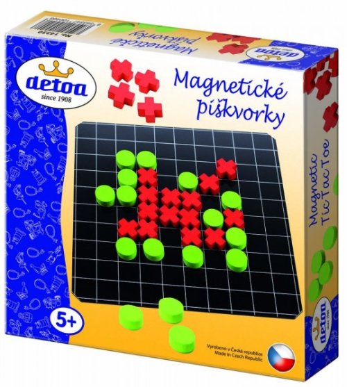 Oblíbená strategická hra pro dva hráče v cestovním provedení. Hra obsahuje plechovou tabulku o rozměrech 165x165 mm a dřevěné herní kameny (kolečka O 15 mm a kříže 16x16 mm) podlepené magnetem.