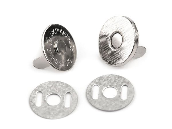 Tenké magnetické zapínání obsahuje speciální silný magnet. Zapínání využijete na klopy kabelek, tašek i psaníček. Návod na použití: 1) Podle nožiček na magnetu si vyznačíme průřezy a prostřihneme látku. 2) Nožičky magnetu prostrčíme tak, aby projely látkou a vykoukly na rubové straně. 3) Na nožičky nasadíme kovový protikus, stiskneme k sobě a nožičky roztáhneme do stran. 4) Druhý díl nasadíme stejným způsobem.
