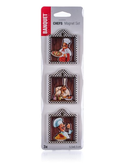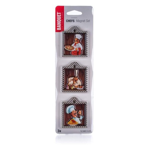Sada 3 ks ozdobných magnetek na lednici s dekorem CHEFS. Magnetky slouží nejen jako dekorace v kuchyni, ale mohou najít i praktické využití např. na připevnění receptů na lednici.