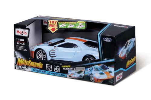 Motosounds 1:24 2019 Ford GT Heritage, světle modrý. Modely Motosounds disponují mimo detailního designu také světelnými a zvukovými efekty. Modely jsou vyrobeny z plastu s kovovými detaily. Modely v měřítku 1:24 patří mezi nejoblíbenější. Stisknutím kapoty aktivujete světla a zvuk motoru. Vyžaduje 2 AA baterie (baterie jsou součástí balení). Baleno v otevřeném boxu. Nevhodné pro děti do 3 let. Rozměry balení: 10,3 x 24,5 x 11 cm. Věk 5+