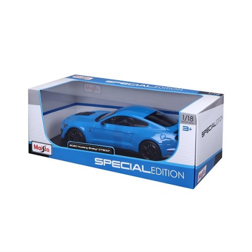 Special Edition 1:18 2020 Mustang Shelby GT500, modrý. Modely Special Edition jsou sbírkou krásného designu s vysokým důrazem na přesnost detailů. Modely jsou vyrobeny z litého kovu s plastovými detaily. Některé z modelů mají nastavitelná sedadla. Plně funkční řízení, detailní podvozek se samostatným výfukovým systémem a odpružená kola. Většina z modelů Special Edition má otevírací dveře, kufr nebo kapotu. Model je namontovaný na plastovém stojanu. Baleno v krabičce. Nevhodné pro děti do 3 let. Rozměry balení: 12,7 x 33 x 16,5 cm. Věk 3+